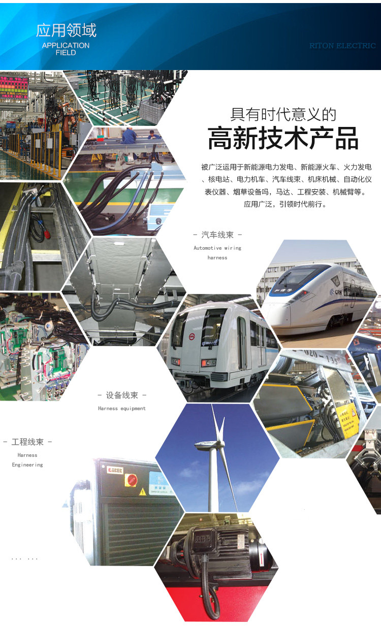 廣泛用于汽車線束,機床機械,電力設備,食品機械,自動化儀,電機馬達等,保護電纜電線不受外力磨損和絕緣